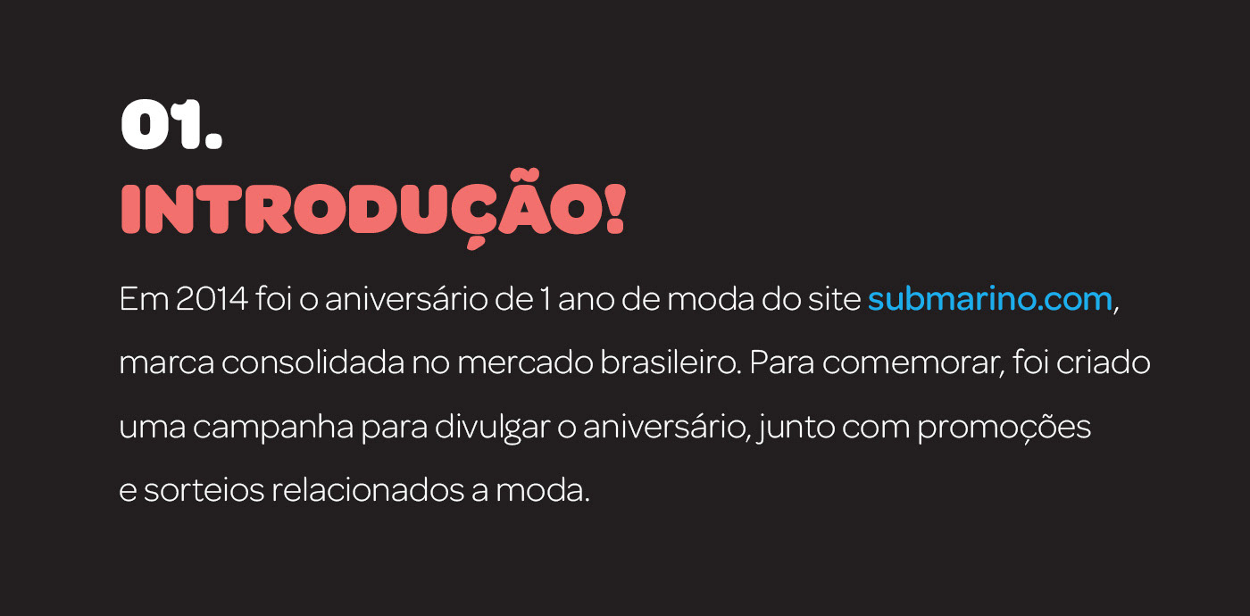 Em 2014 foi o aniversário de 1 ano de moda do site submarino.com, marca consolidada no mercado brasileiro. Para comemorar, foi criado uma campanha para divulgar o aniversário, junto com promoções e sorteios relacionados a moda.